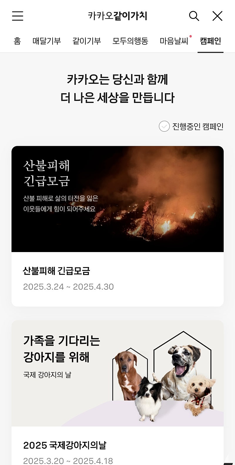 클릭 > 캠페인 > 산불피해 긴급모금