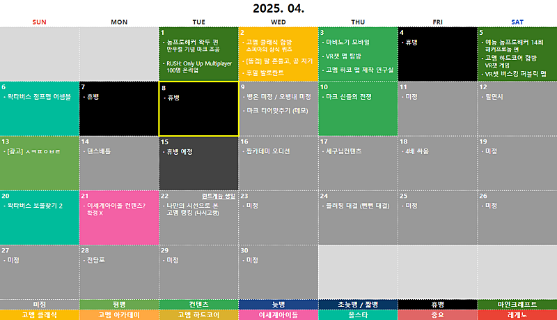 준비해서 누가 보냈는지 맞추기) ③ 눕프핵 챔피언쉽 ④ 똥겜 드림팀 ⑤ 고멤 기획 -> 아바타 제작 -> 성우모집식의 고멤오디션 ⑥ VR챗 채팅, 도네 연동 ⑦ 기괴한 체육대회 ⑧ 질문 순위 맞추기 (무슨 질문이길래 내가 6위지?)