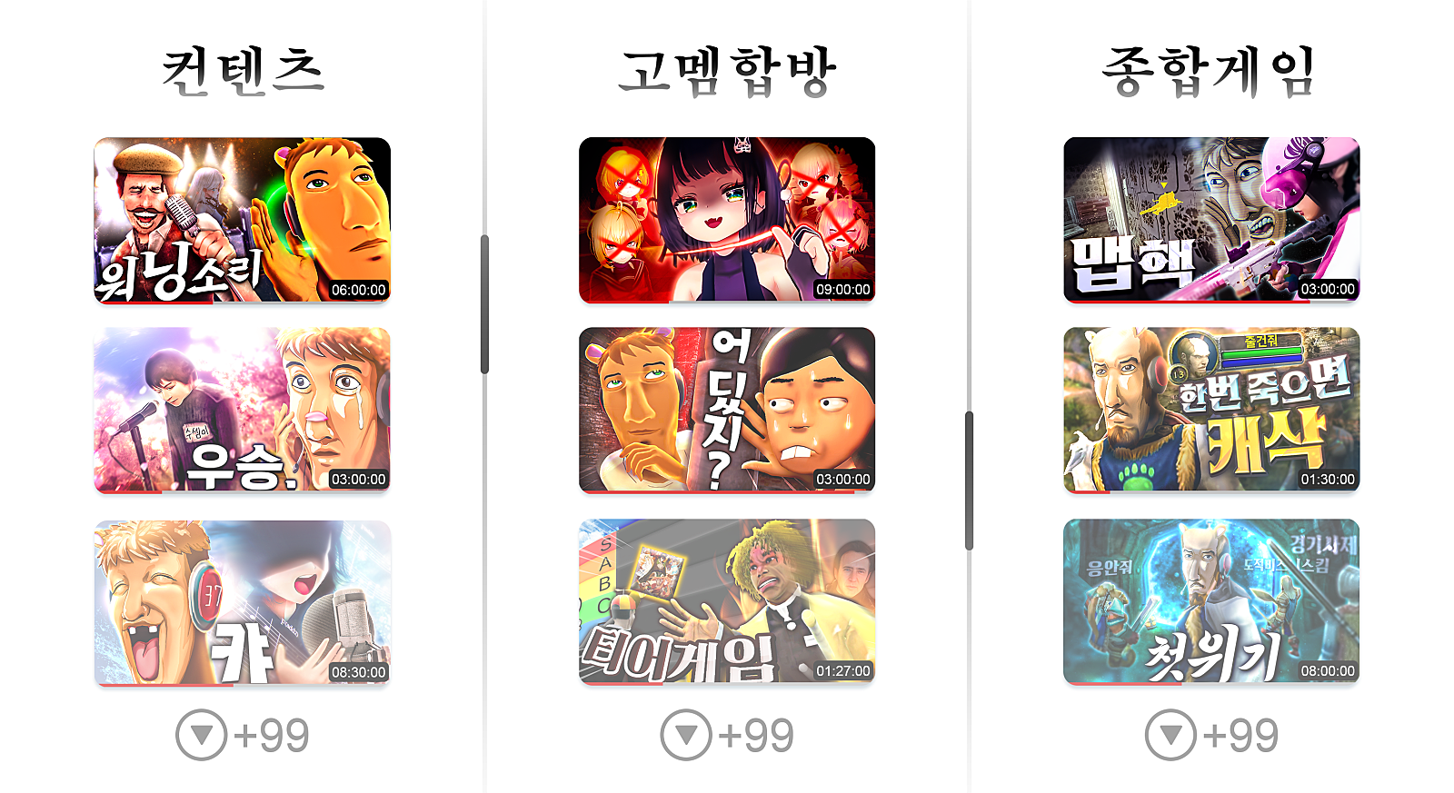 대충 장르 예시) 마인크래프트, 노가리, 합방, 핫클립, 오디션, 뮤비, 똥게임 등등
