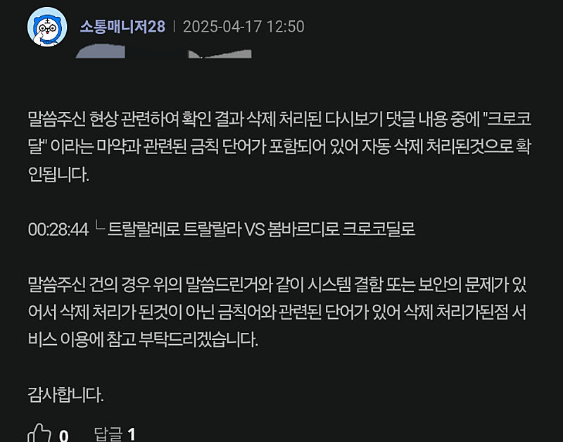문의 결과 댓글에 '붐바르디로 크로코딜로' 의 '크로코' 가 마약과 관련된 금칙 단어라 자꾸 삭제되는 거였다고 해ㅋㅋㅋ