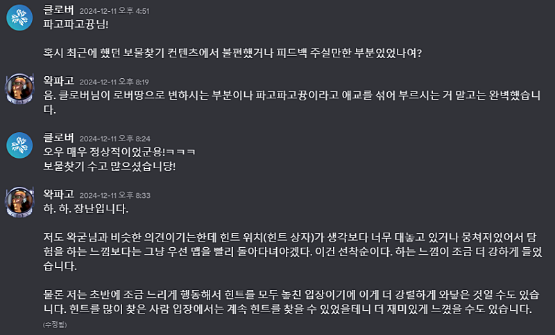 보물찾기 1 이 끝난 뒤 참가하신 모든 참가자분들에게 연락을 해서 1 에서의 개선점등의
