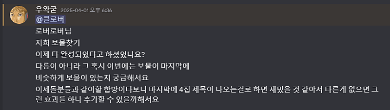 보물찾기 2 제작이 끝났다는 발표를 하고, 프로젝트 마무리 작업을 하고 있던 도중에