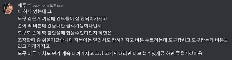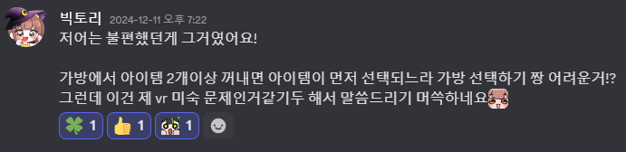 1 에서 공통적으로 나왔던 피드백 사항이 VR 상태에서의 인벤토리 조작 등이었는데