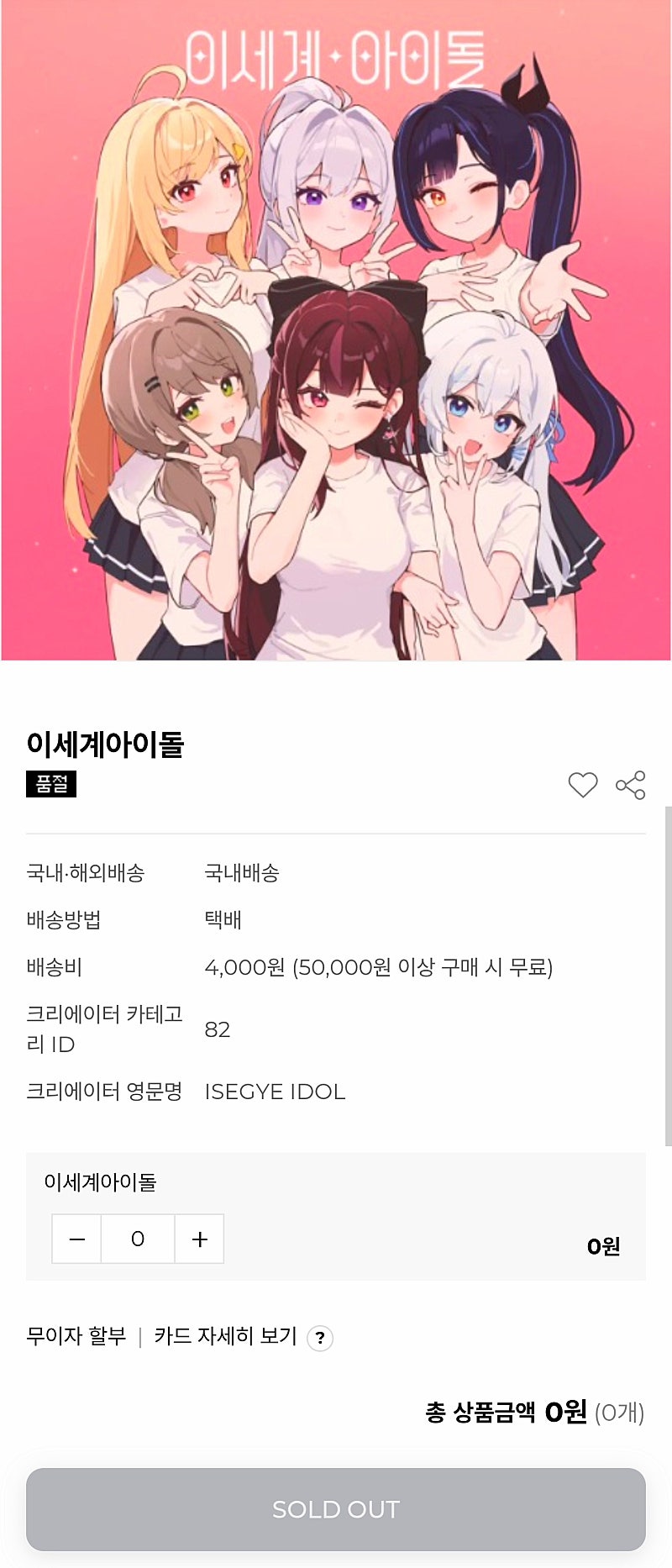 관심상품 공유하기 이세계아이돌 국내·해외배송 국내배송 배송방법 택배 배송비 4,000원 (50,000원 이상 구매 시 무료) 크리에이터 카테고리 ID 82 크리에이터 영문명 ISEGYE IDOL 이세계아이돌 수량증가 수량감소 0 무이자 할부 | 카드 자세히 보기 ? 총 상품금액 0 (0개) SOLD OUT 상품구매안내 상품결제정보 고액결제의 경우 안전을 위해 카드사에서 확인전화를 드릴 수도 있습니다. 확인과정에서 도난 카드의 사용이나 타인 명의의 주문등 정상적인 주문이 아니라고 판단될 경우 임의로 주문을 보류 또는 취소할...