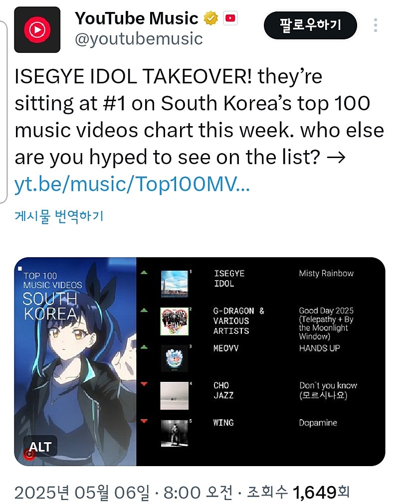 형 유튜브 뮤직 공식 트위터에서 이세돌 1위 트윗 올라온거봤어?