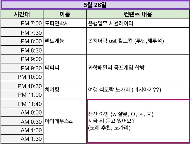 26일 오늘의 고릴뱅 시간표
