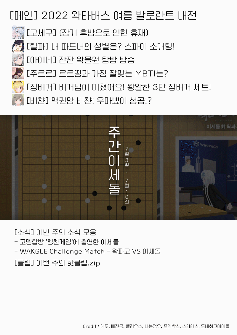 7월 8일, 우왁굳님 방송에서 진행된 고정멤버 합방인 '칭찬게임'의 칭찬 영상들에 이세계 아이돌이 출연했다는 소식입니다.