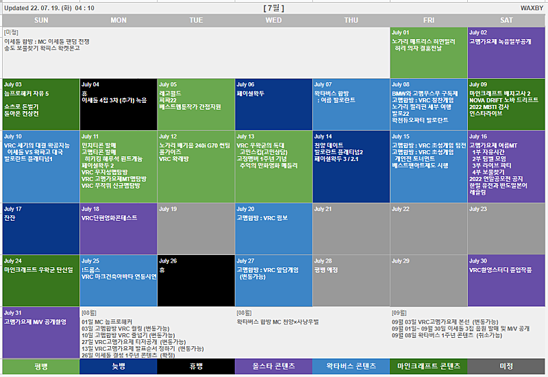 WAXBY | 보물찾기 비하인드 / 권민팀이 닭다리 찾은 이유 / 스즈메의 문단속 공식 예고편 분석 예측안 / 7월 8월 9일 일정 조정 / 연간 일정 조정 / 2022 연말공모전 부문 기획 및 공지 / 한국인과 일본인의 유전과 반도일본어 가설 / 레슬링과 격투기 / 레고월드 황제란 교도소장