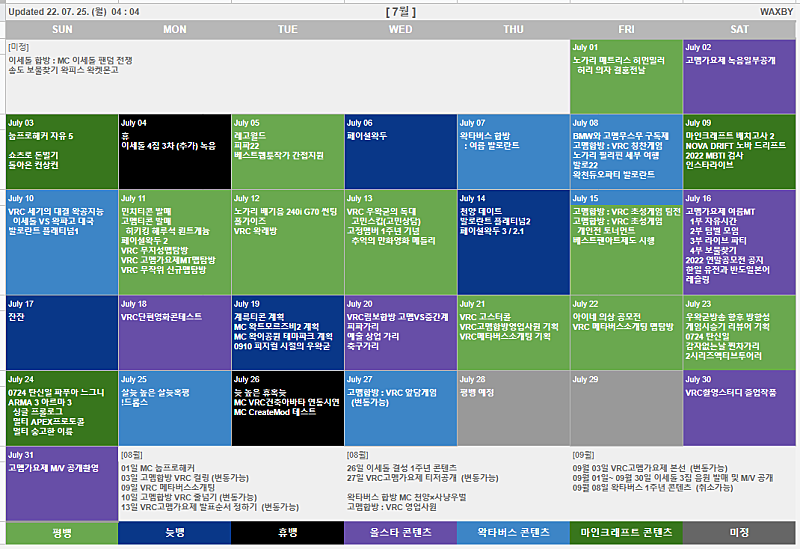WAXBY | 보물찾기 비하인드 / 권민팀이 닭다리 찾은 이유 / 스즈메의 문단속 공식 예고편 분석 예측안 / 7월 8월 9일 일정 조정 / 연간 일정 조정 / 2022 연말공모전 부문 기획 및 공지 / 한국인과 일본인의 유전과 반도일본어 가설 / 레슬링과 격투기 / 레고월드 황제란 교도소장