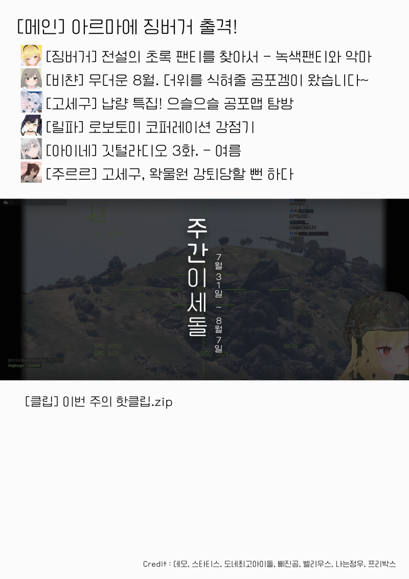 이후에는 MMD 탐방을 진행하셨는데요. 스푼버거, 기네스버거, 애송이버거, 단발 멜빵버거 등 다양한 아바타로 다양한 MMD를 즐길 수 있었습니다. 똥강아지들과 함께 꾸몄던 무대에서 똥강아지에게 센터를 빼앗긴 아이돌의 슬픔은 덤입니다. 중요한 파트까지 다 뺏겨버렸어,,, 마지막으로 밴드 오브 브라더스 같이보기까지 알차게 채운 화요일 방송이었습니다. 다음에 또 봐요! 안녕~