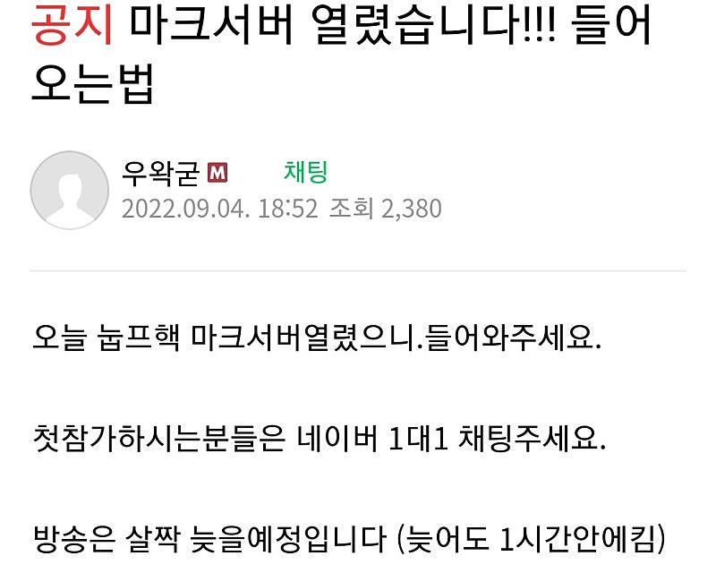 방제: 마크 눕프핵 입장할 예정입니다. 스포 채팅 조심해주세요