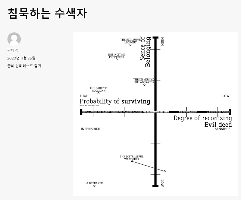 당신은 타협적인 성향을 가지고 있습니다. 자신이 피해를 주지 않으면 그만이라는 생각을 가지고 있으며, 실제로도 이런 재난 상황에서 그 정도는 선한 성향에 들지 않나 생각하는 편입니다. 하지만 상술했듯이 당신의 타협적인 성향은 불의를 지켜볼 때 짙게 드러나곤 합니다. 경계하는 스캐빈저가 그 어떤 상황에서도 자신의 피해를 줄이면서 자신의 이득을 최대화하는 것이라면, 당신은 자신의 피해도 없는 동시에 이득도 없는 것을 추구합니다. 경계하는 스캐빈저 보다는 악행과 거리가 있는 편이지만, 부득이한 정찰자 만큼 불의에 자극을 받지는 않는 편입니다.