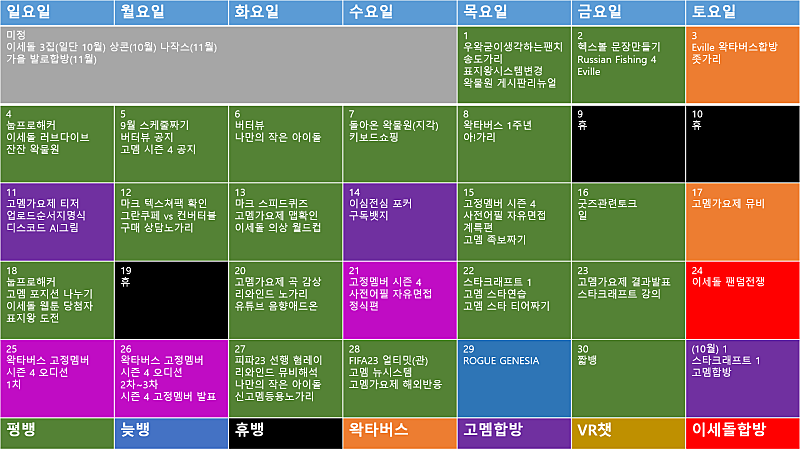 고정멤버 시즌 3 인기투표 / 고정멤버 선거유세 / 고정멤버 포지션 나누기 / 눕프로해커 자유 / 이세돌 웹툰 당첨자 공지 / 우왁굳의 표지왕 도전