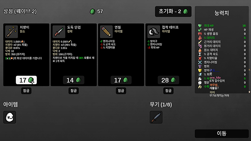 *웨이브 클리어시 능력치 레벨업, 상점 등장