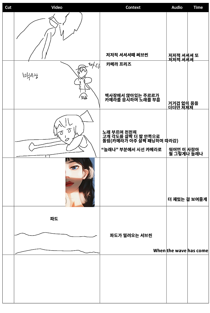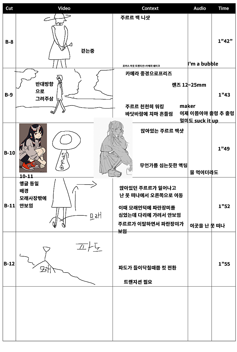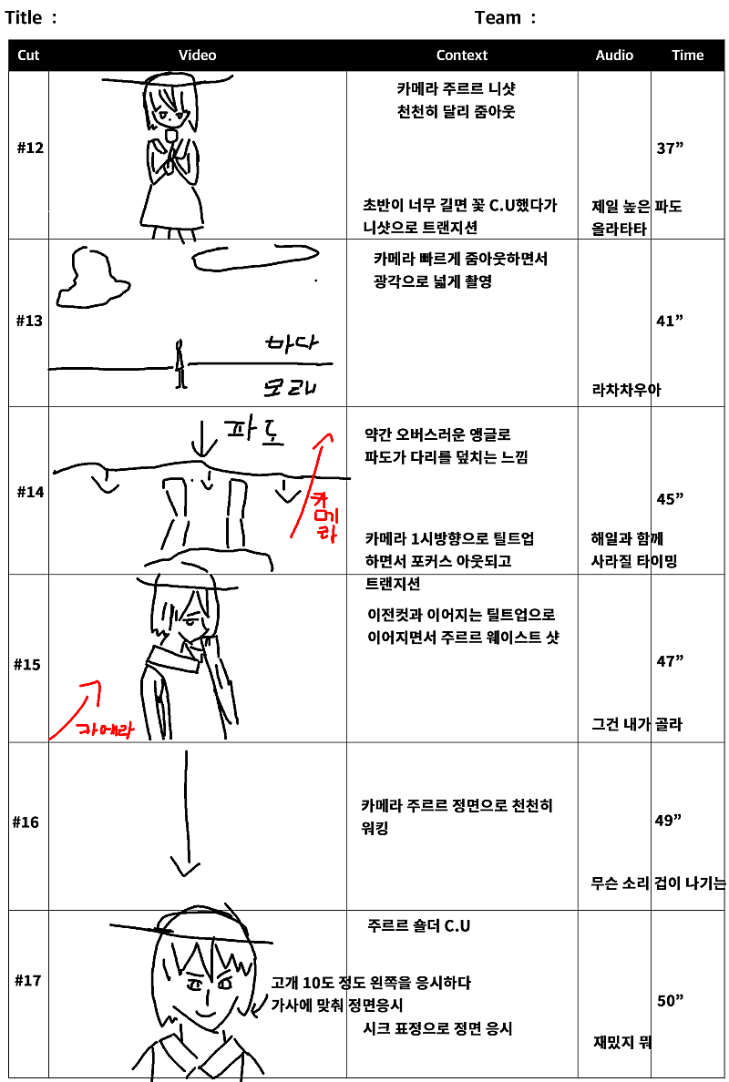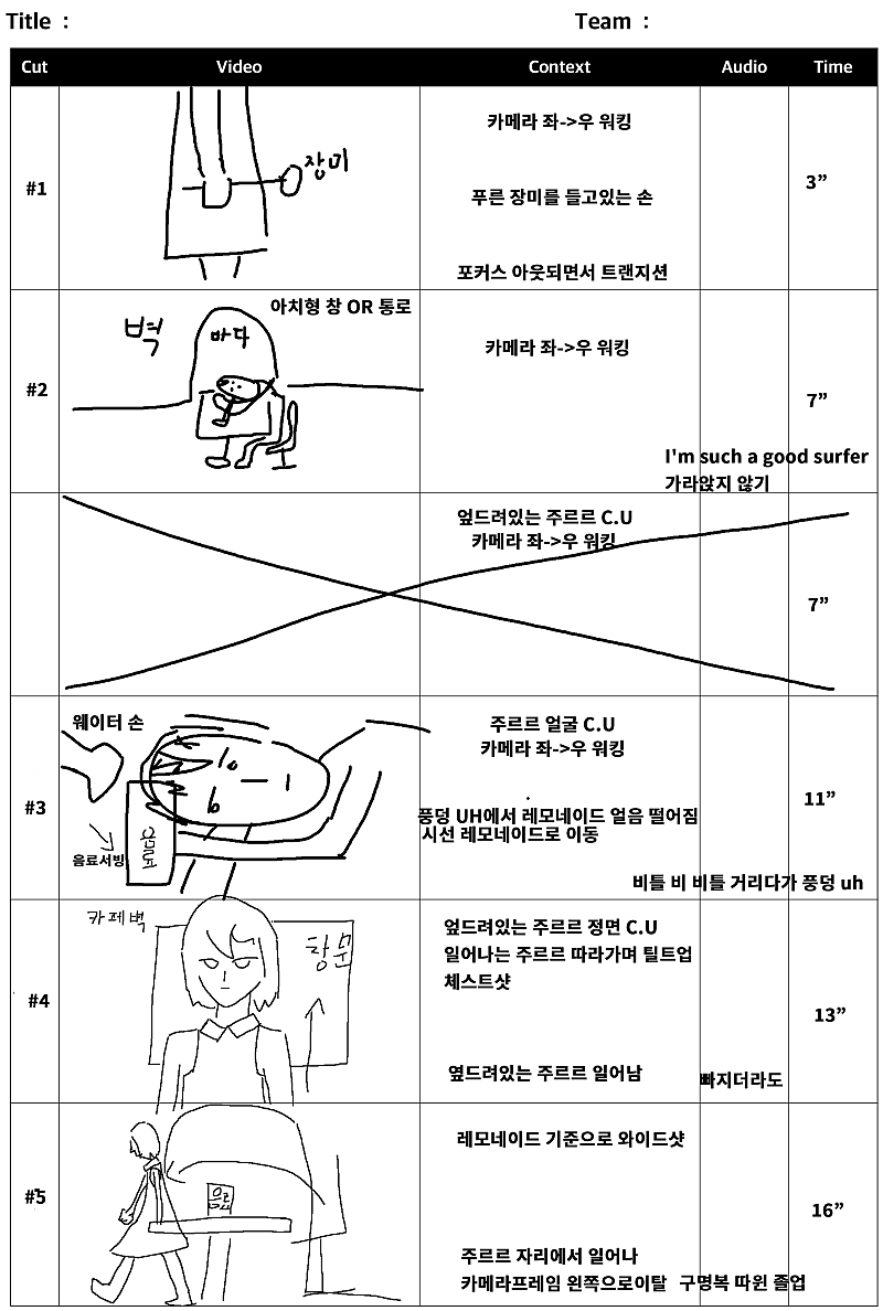당연히 뮤비에 스토리보드가 필요했고 제가 직접 그렸습니다만... 이런 스토리보드는 팀원들과 원활한 소통이 불가능했습니다...