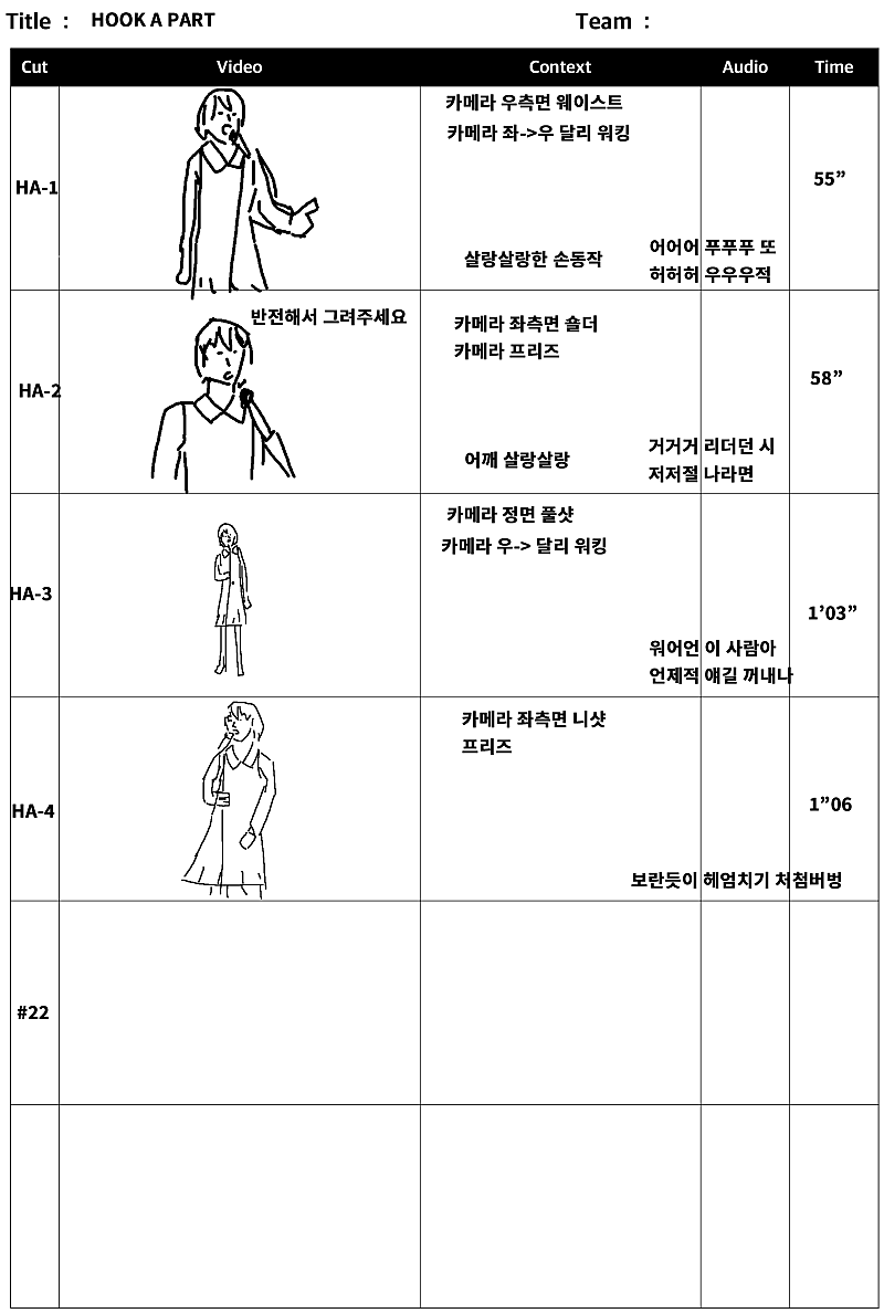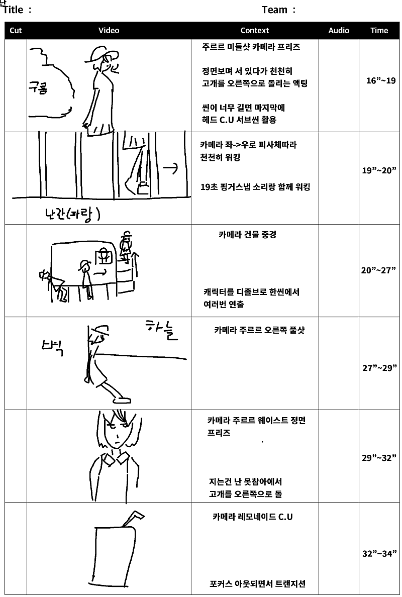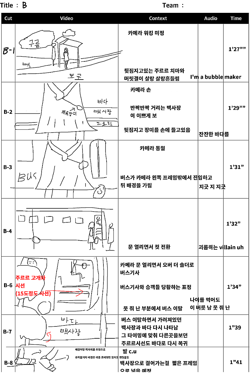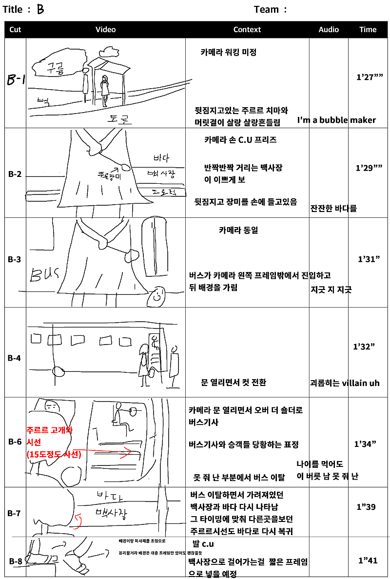 당연히 뮤비에 스토리보드가 필요했고 제가 직접 그렸습니다만... 이런 스토리보드는 팀원들과 원활한 소통이 불가능했습니다...