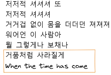 이곳을 못 떠난다는 화자는 갑자기 거품처럼 사라질게라면서 훅하고 사라져버립니다