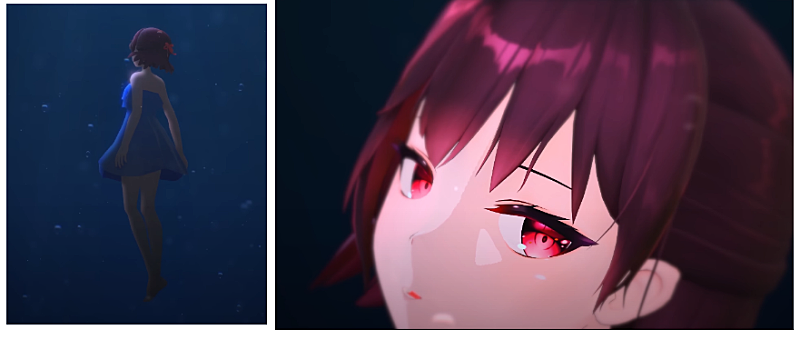 하늘씬과 바다씬은 하강이라는 같은 시련을 경험하고있지만 가장 큰 차이점이 있습니다 하늘에서는 당황하는 모습과 허우적거리는 모습이 있었다면 바다에서의 하강은 오히려 정적이죠