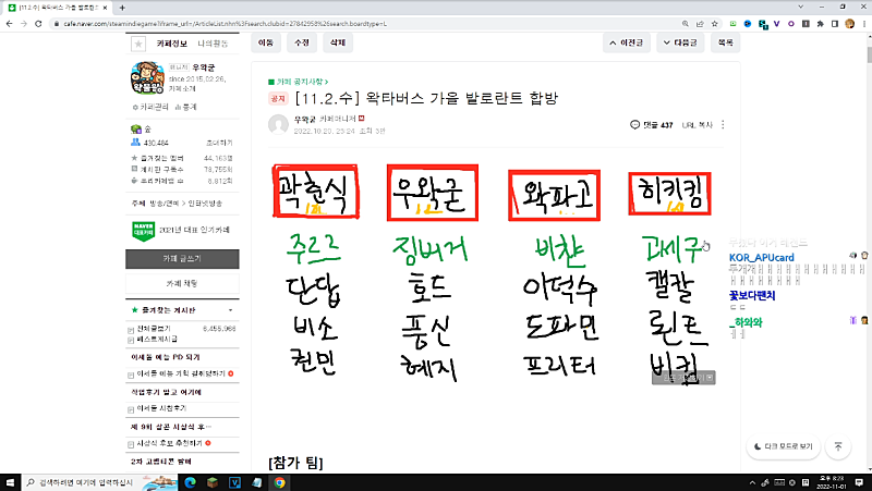 *왁타버스 발로란트 합방 대진표 공지 작성