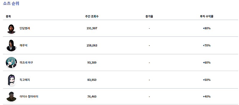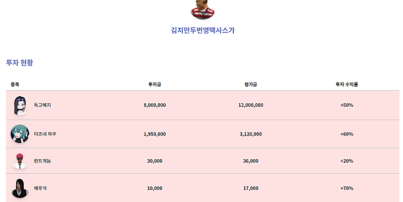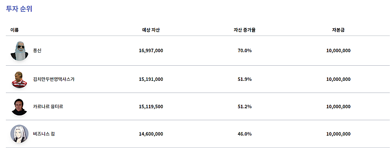 이름 예상 자산 자산 증가율 자본금 풍신 16,997,000 70.0 % 10,000,000 김치만두번영택사스가 15,191,000 51.9 % 10,000,000 카르나르 융터르 15,119,500 51.2 % 10,000,000 비즈니스 킴 14,600,000 46.0 % 10,000,000 권민 14,458,000 44.6 % 10,000,000 이덕수 할아바이 14,100,000 41.0 % 10,000,000 프리터 13,935,000 39.4 % 10,000,000 해루석 13,900,000 39.0 % 10,000,00...