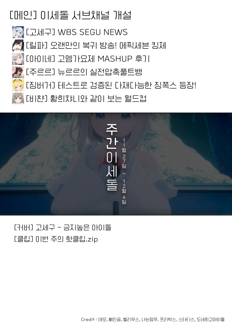 Credit : 데모, 삐진곰, 벨리우스, 나는정우, 프리박스, 스타티스, 도네최고아이돌