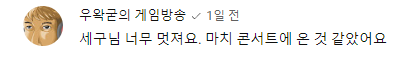 공개 직후에는 역시나 또 기대컨을 박살내놓은 뮤비의 퀄리티와 고세구님의 청아한 음색에 감탄하는 반응이 이어졌습니다. 10개월 전 우리를 감동시켰던 팬서비스에서 더더욱 발전한 왁타버스와, 고세구님이었네요.