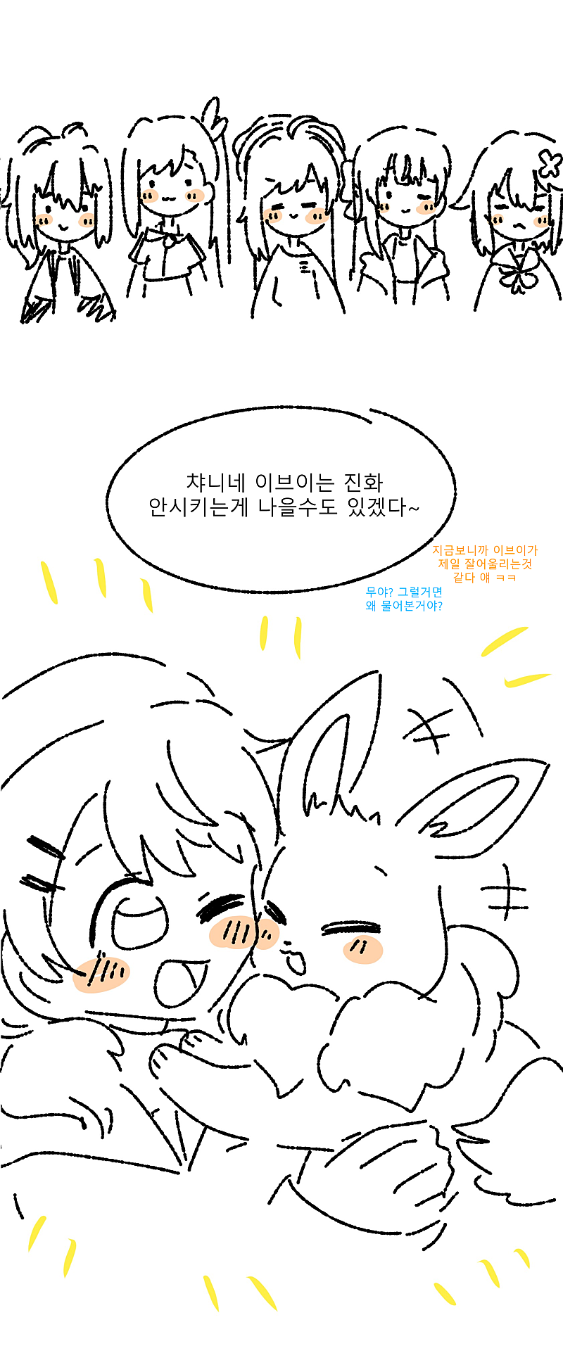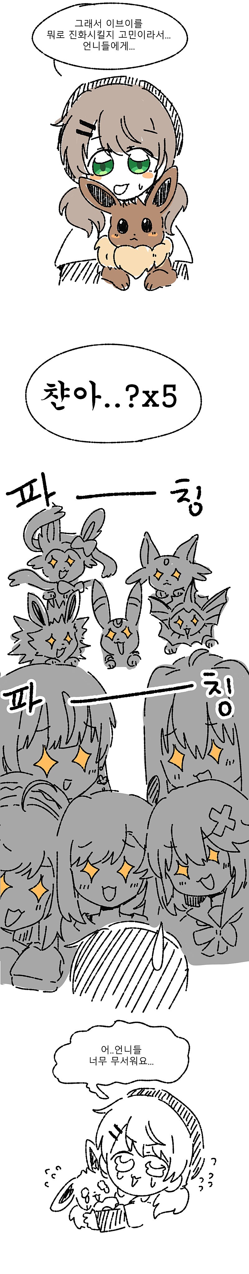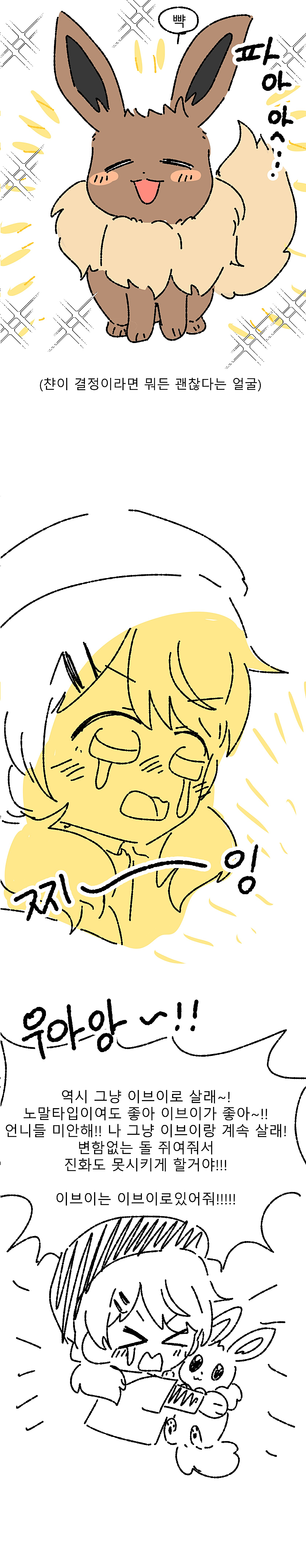 비챤이 이브이 뭐로 진화시킬지 고민하는 만화(+반응)