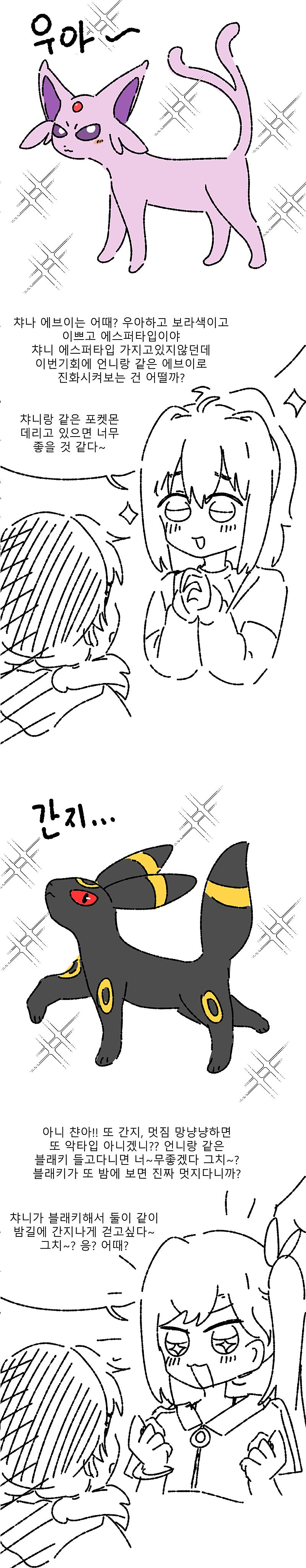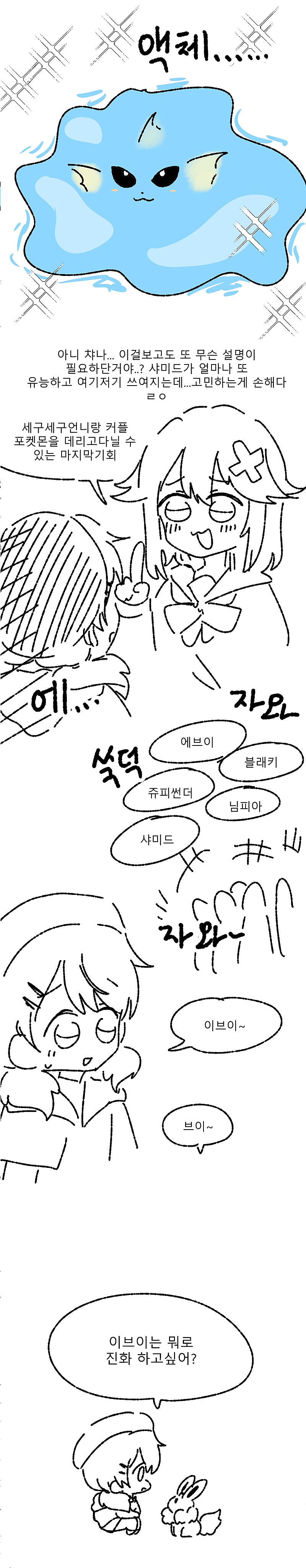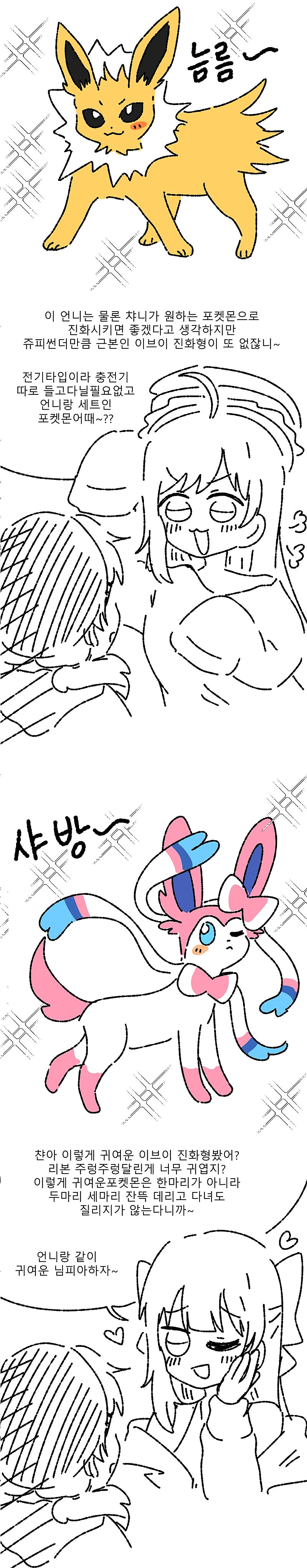 비챤이 이브이 뭐로 진화시킬지 고민하는 만화(+반응)