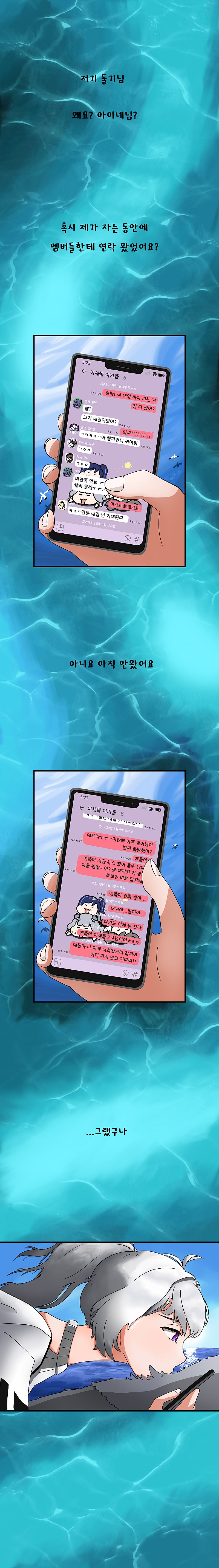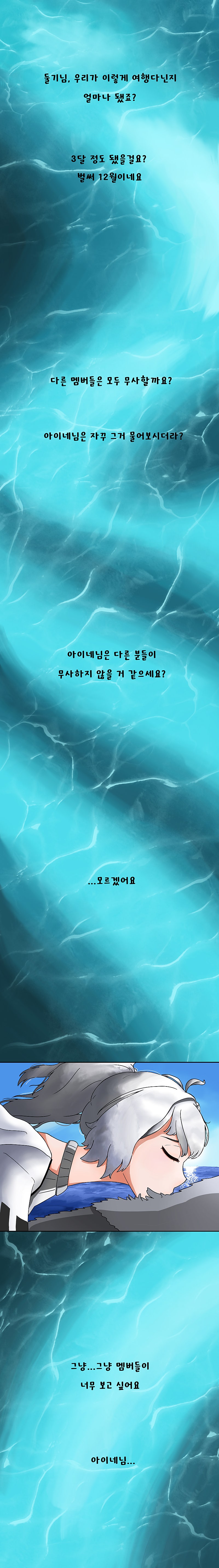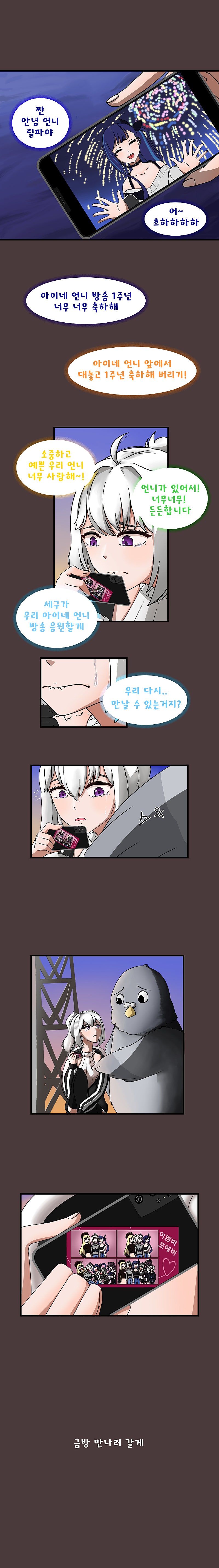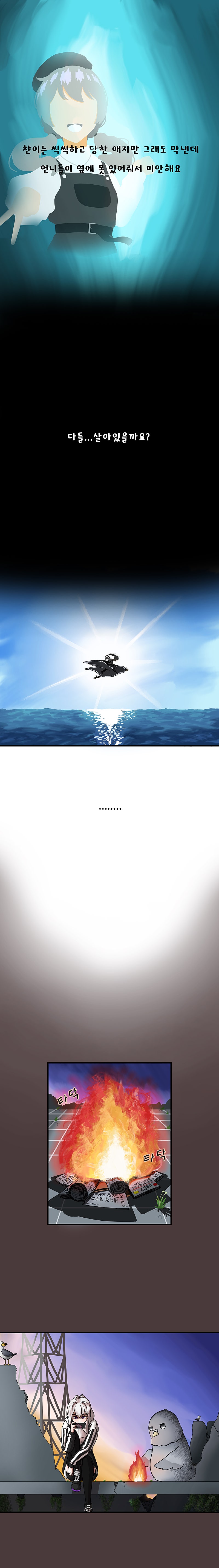 +혹시라도 다음화를 기다리고 있으실 분들을 위해) 우선 제 만화를 좋아해주셔서 감사합니다. 이런 말씀 드리게 되어 죄송하지만 아마 다음화는 좀 시간이 많이 걸릴 것으로 예상되어요. 한 달 온전히 시간 들여도 모자란데 제가 지금 아파서 손을 못대고 있어요. 적어도 이번 달에는 안 나올걸로 예상하고 있습니다. 그렇기 때문에 제 만화는 잠시 잊고계셨다가 제가 다음화 올리면 돌아와 주세요. 최대한 빨리 돌아올 수 있도록 애쓰겠습니다. 감사합니다.